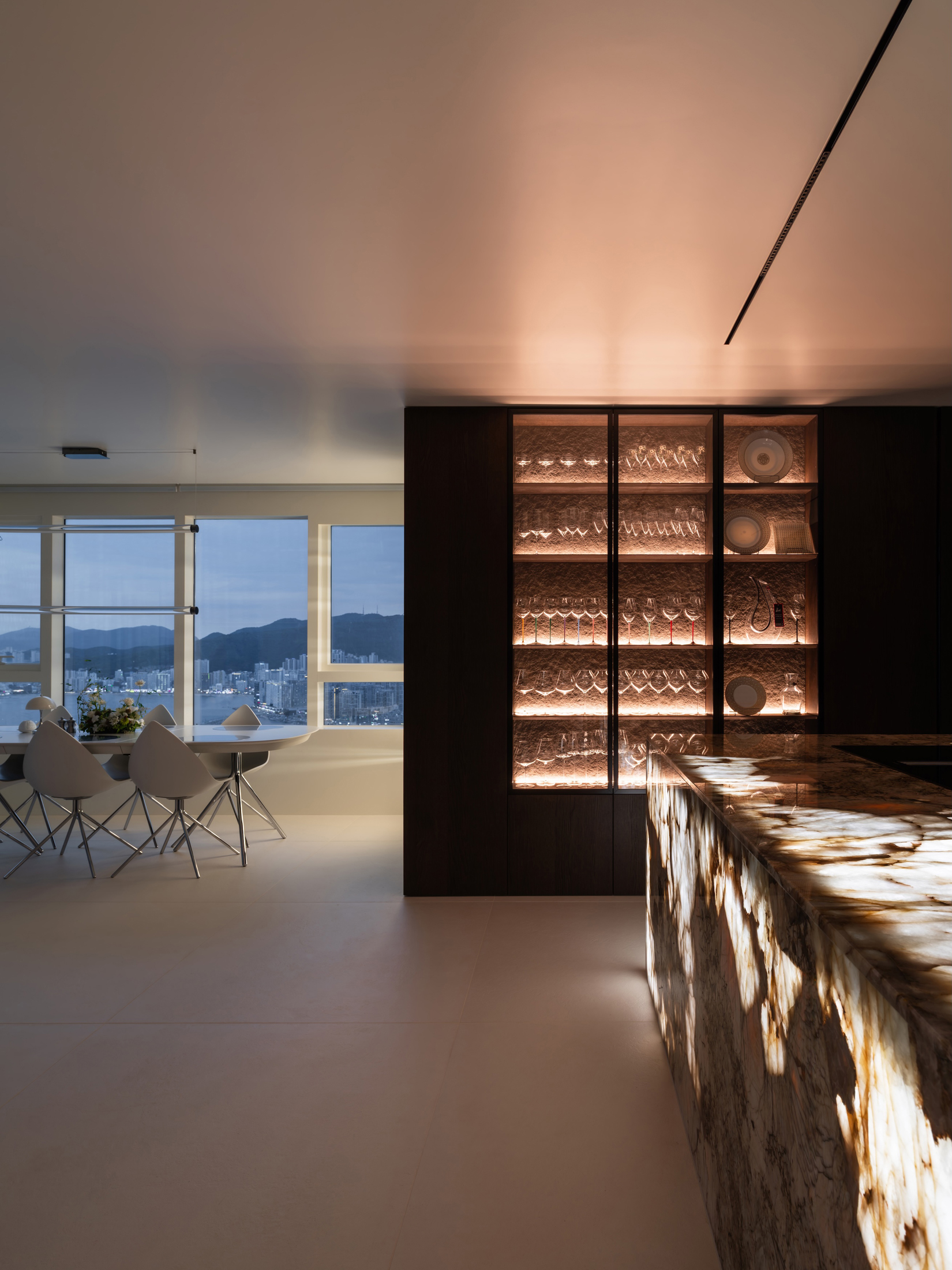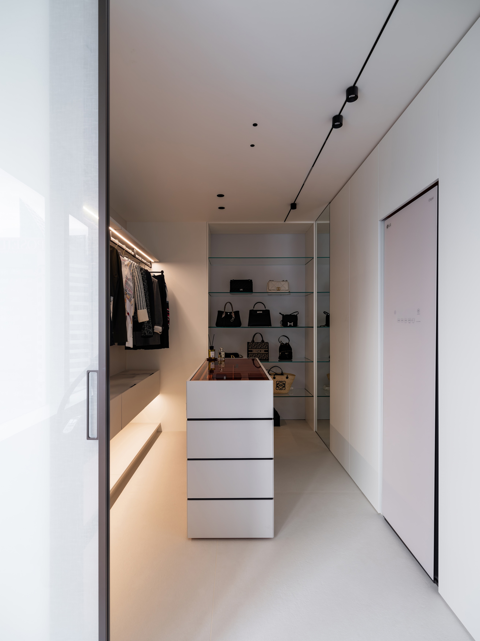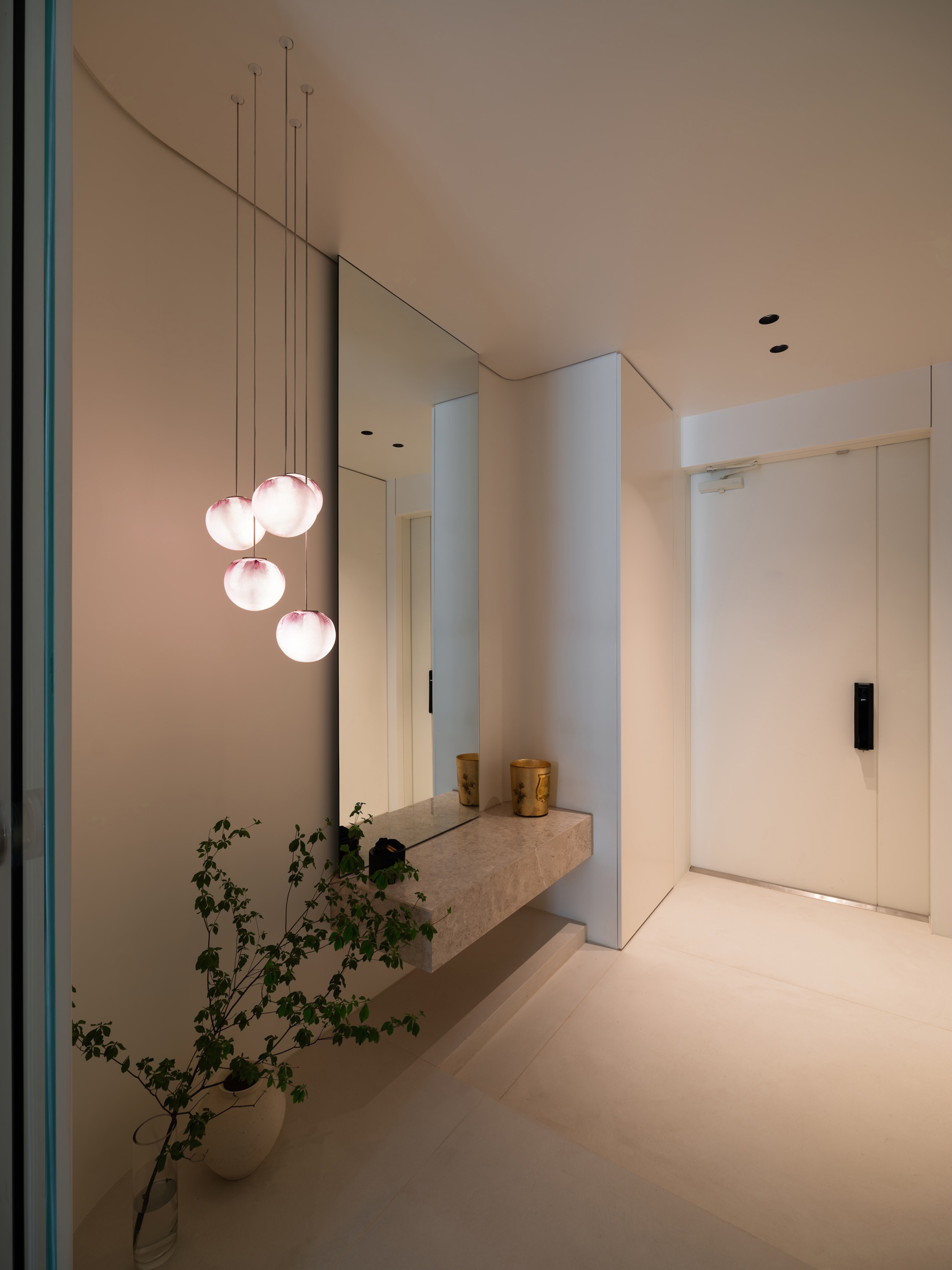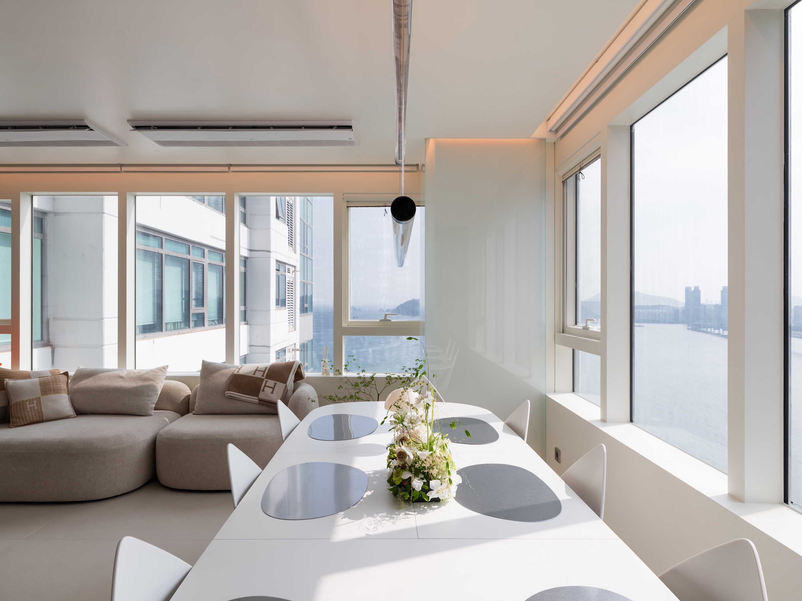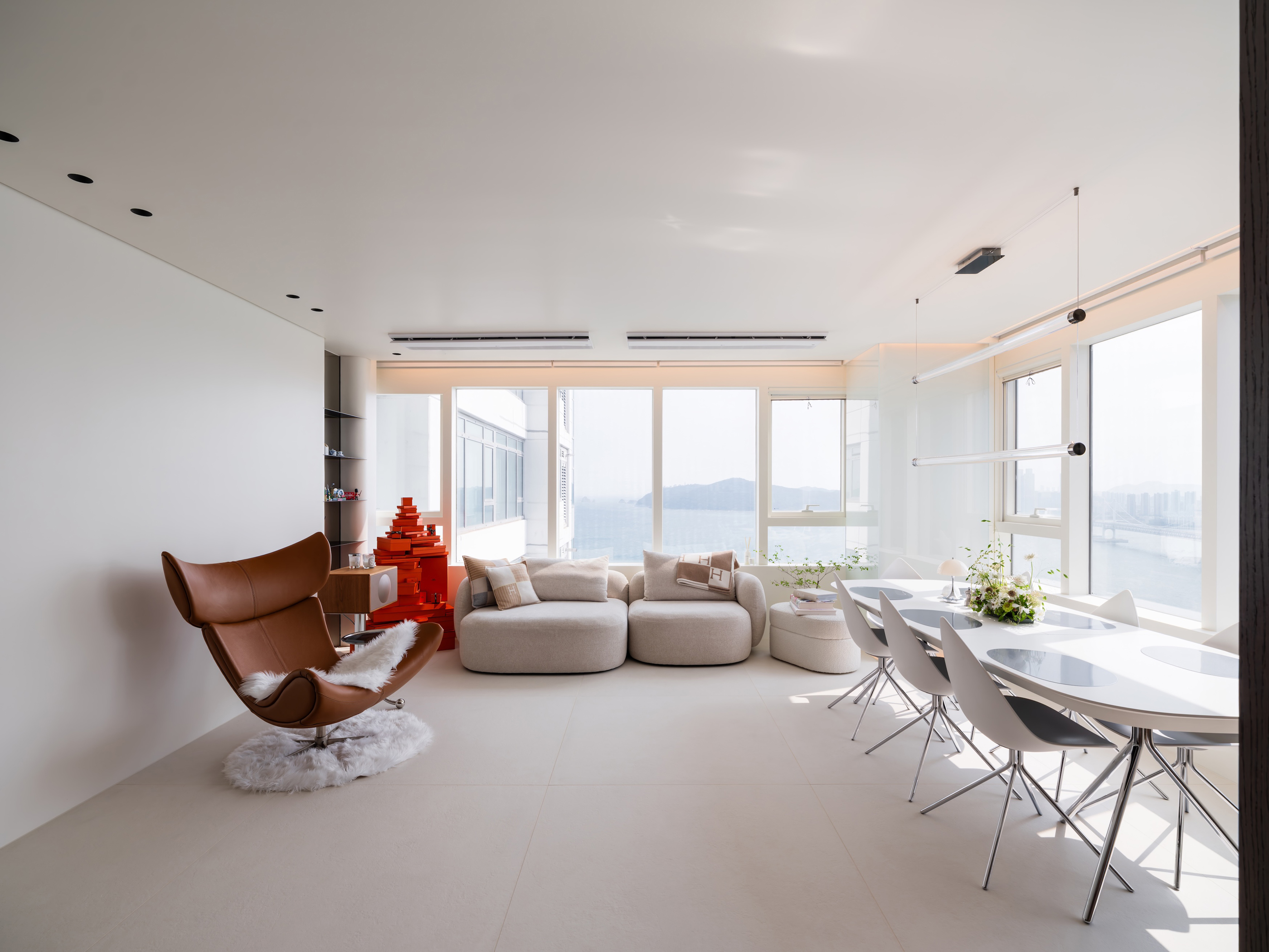 해운대 마린시티의 정점에 위치한 아델리스는 오피스텔 타입 주거 형태로 기존 평면을 개선해 필요한 공간을 극대화하는 레이아웃 작업에 매우 많은 노력을 기울인 공간이다. 불필요한 공간은 과감히 철거해서 필수적인 공간으로 편입시켜 공간을 확대했으며, 고객의 취향과 공간의 특성에 맞는 고급 마감재들로 미감이 충족되도록 설계하였다. 바다와 가장 가까운 곳에 위치한 아델리스의 아침은 윤슬에 반사된 자연광이 집안 내부를 충분히 밝히고 있다. 공간이 자연광을 충분히 머금을 수 있도록 고급도장마감으로 공간 전체를 계획했다. 사실 이번 공간의 특별함은 해가 진 이후부터 드러난다. 클라이언트와 충분히 고민해서 만들어낸 조명 위치와 개수, 그리고 조명하는 방식은 공간을 더욱 완결성 있게 만드는 핵심이었다.