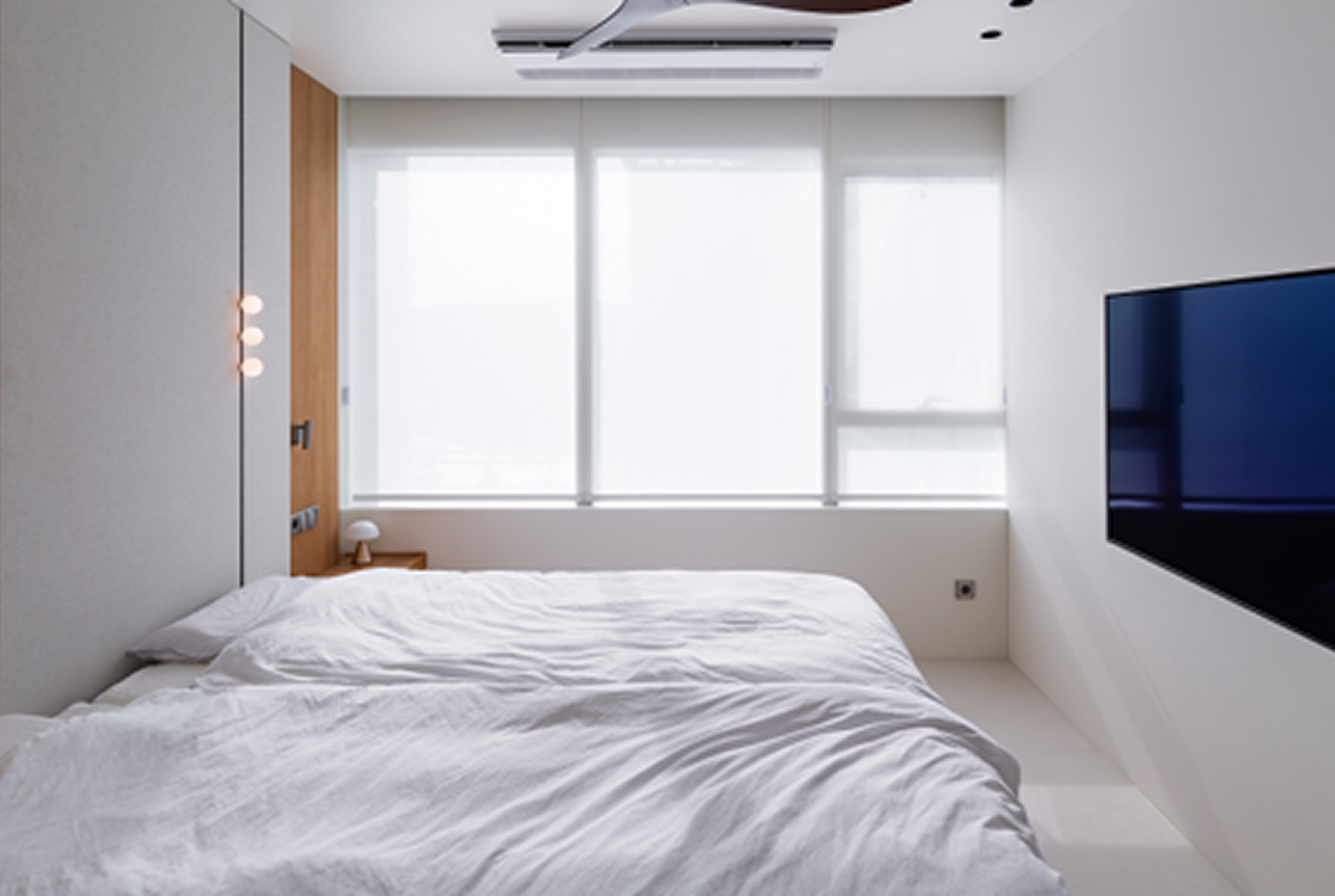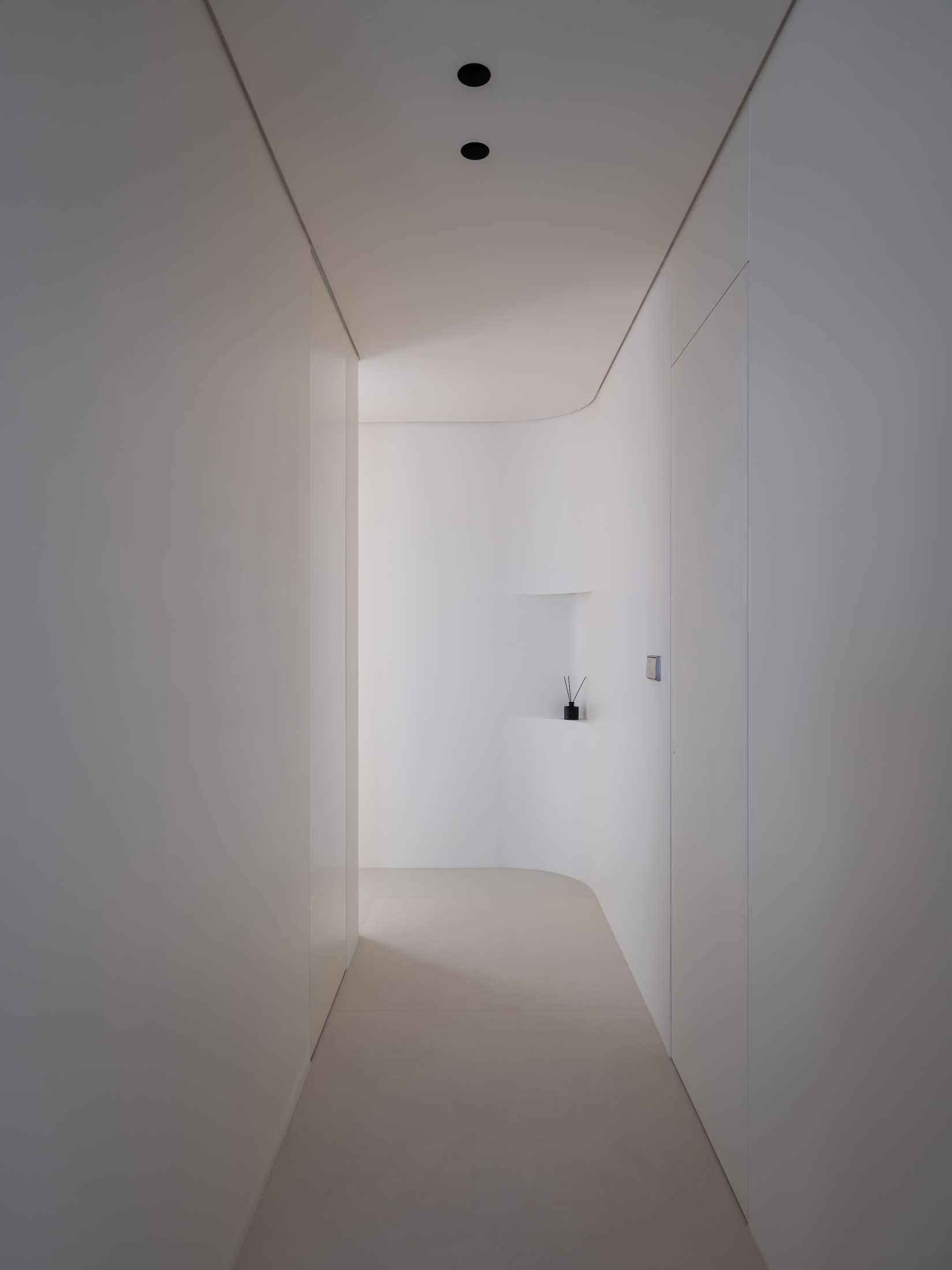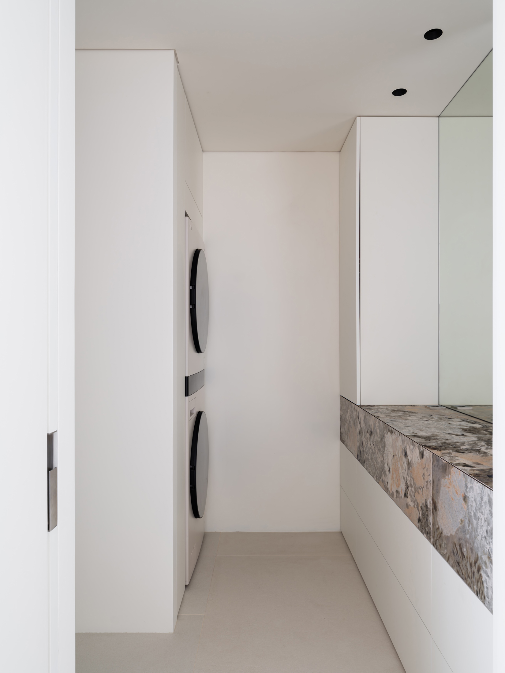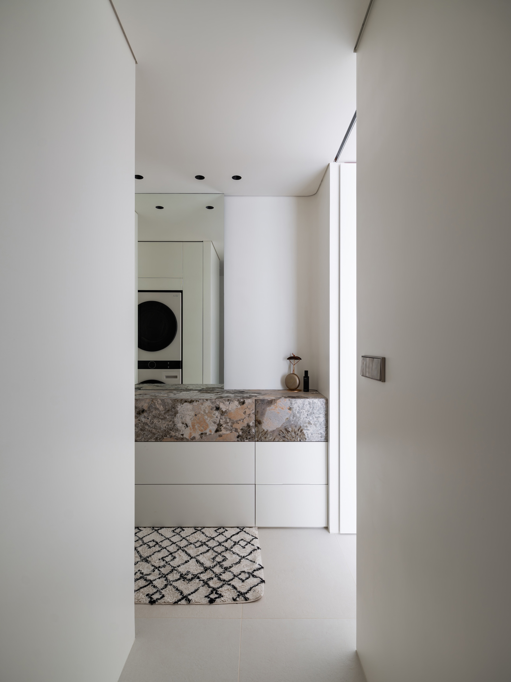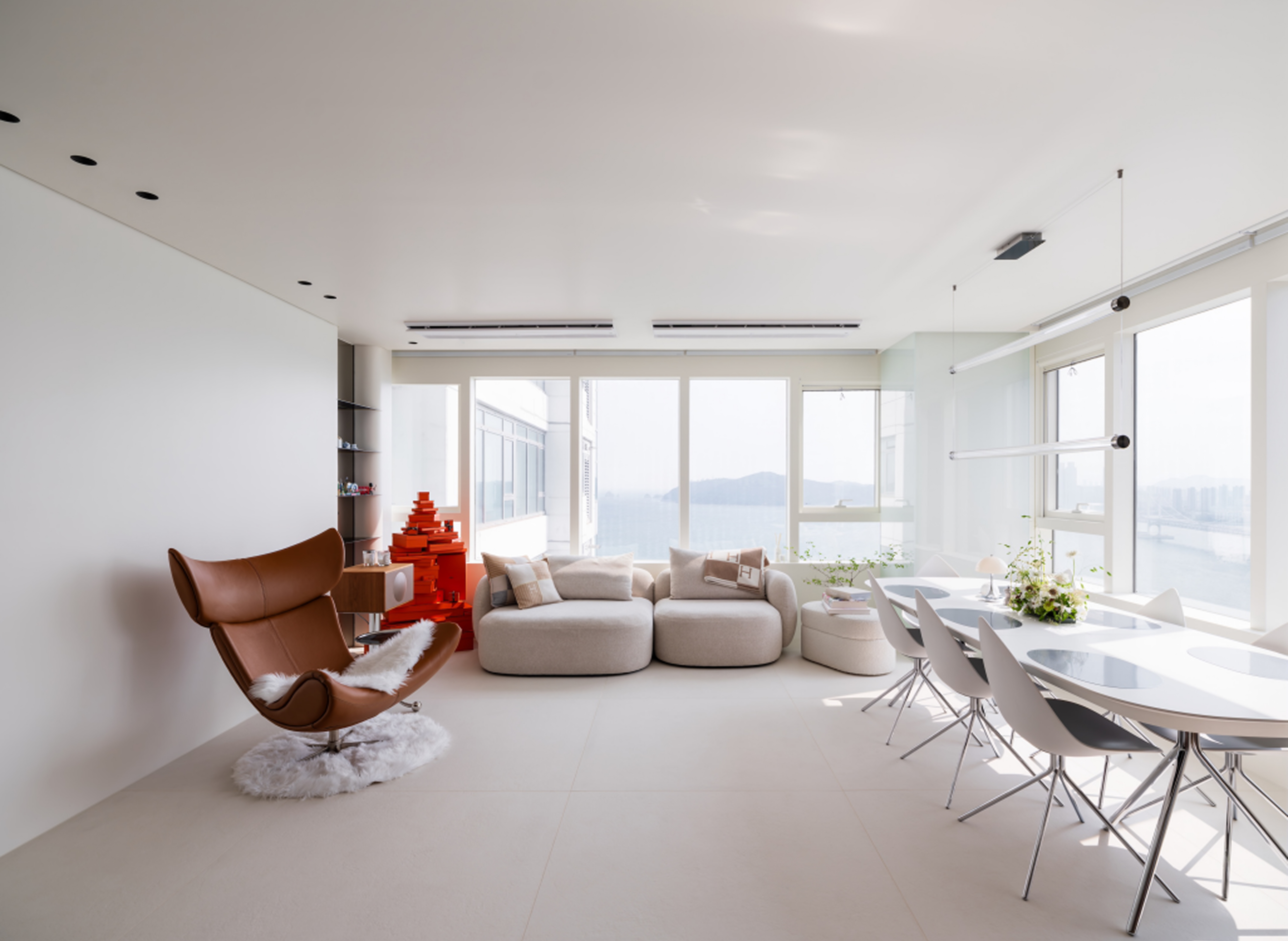 해운대 마린시티의 정점에 위치한 아델리스는 오피스텔 타입 주거 형태로 기존 평면을 개선해 필요한 공간을 극대화하는 레이아웃 작업에 매우 많은 노력을 기울인 공간이다. 불필요한 공간은 과감히 철거해서 필수적인 공간으로 편입시켜 공간을 확대했으며, 고객의 취향과 공간의 특성에 맞는 고급 마감재들로 미감이 충족되도록 설계하였다. 바다와 가장 가까운 곳에 위치한 아델리스의 아침은 윤슬에 반사된 자연광이 집안 내부를 충분히 밝히고 있다. 공간이 자연광을 충분히 머금을 수 있도록 고급도장마감으로 공간 전체를 계획했다. 사실 이번 공간의 특별함은 해가 진 이후부터 드러난다. 클라이언트와 충분히 고민해서 만들어낸 조명 위치와 개수, 그리고 조명하는 방식은 공간을 더욱 완결성 있게 만드는 핵심이었다.