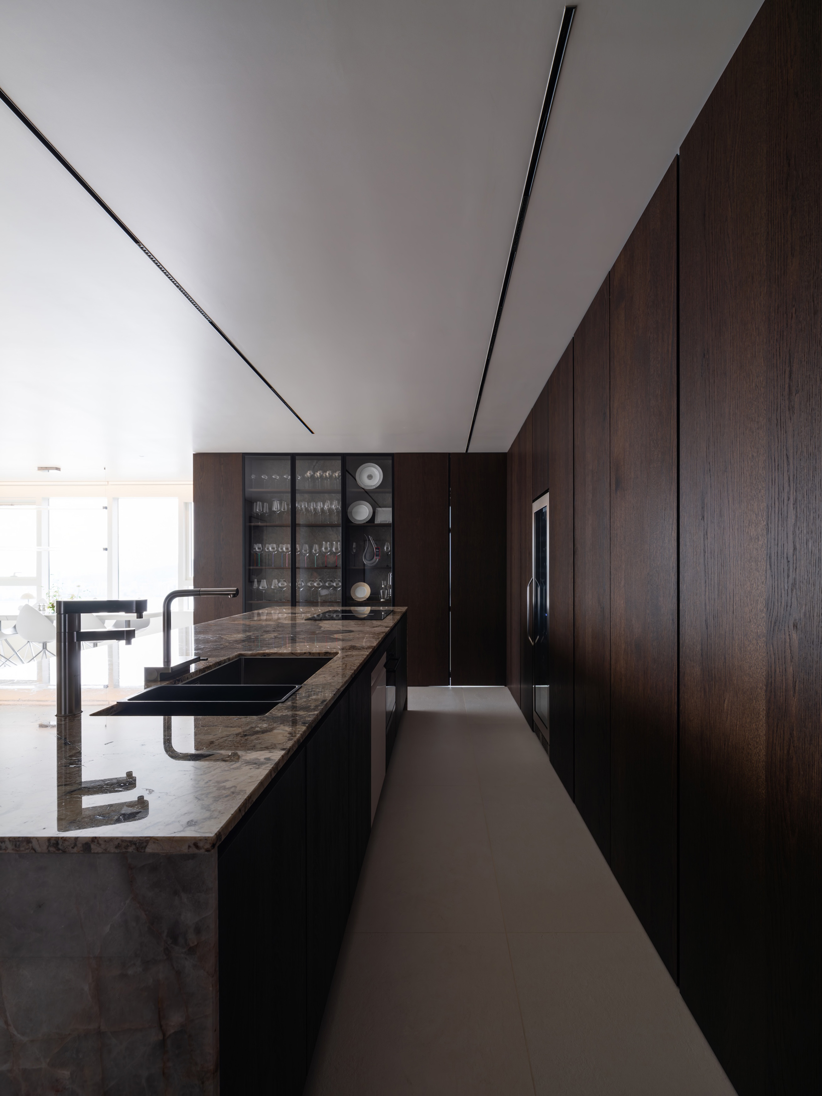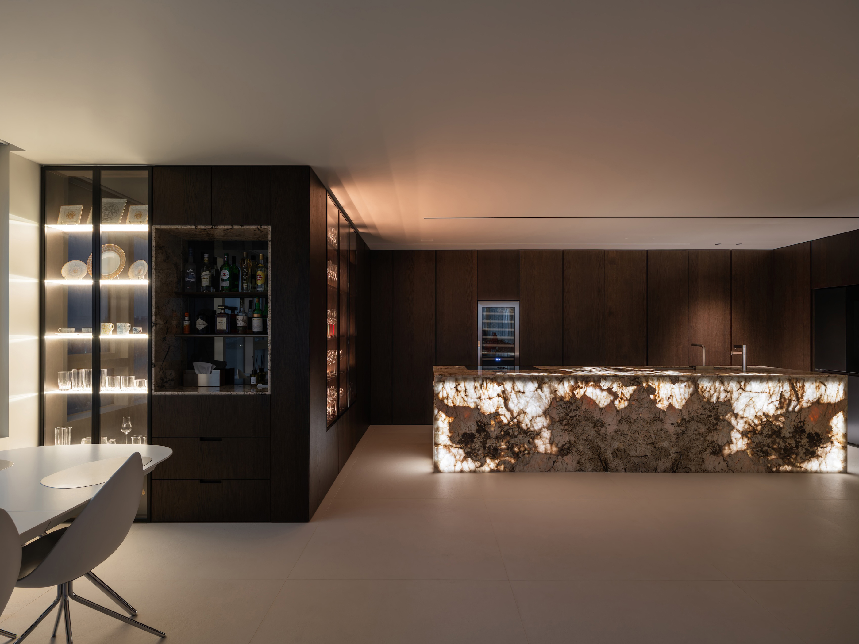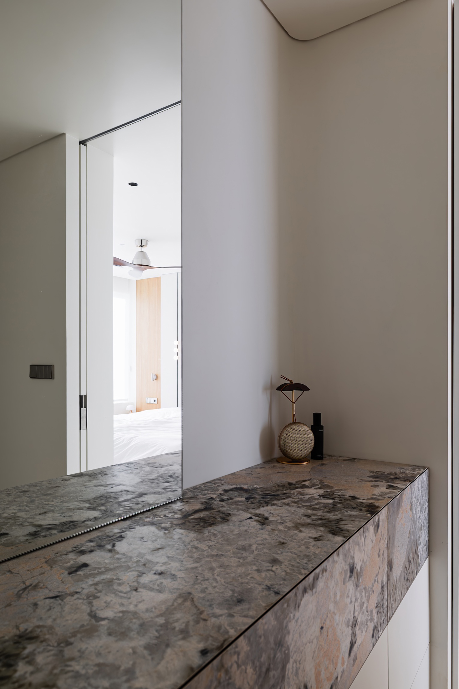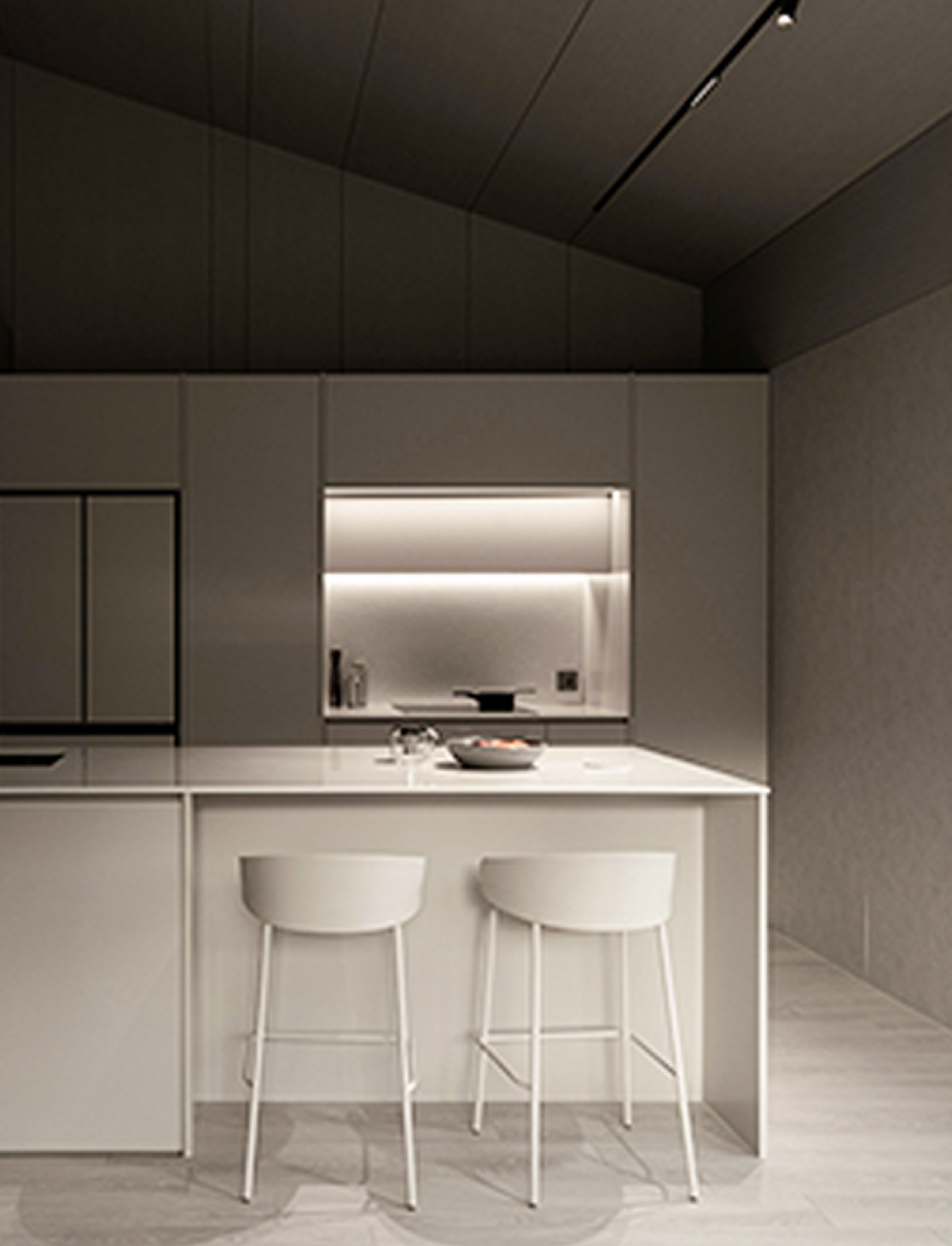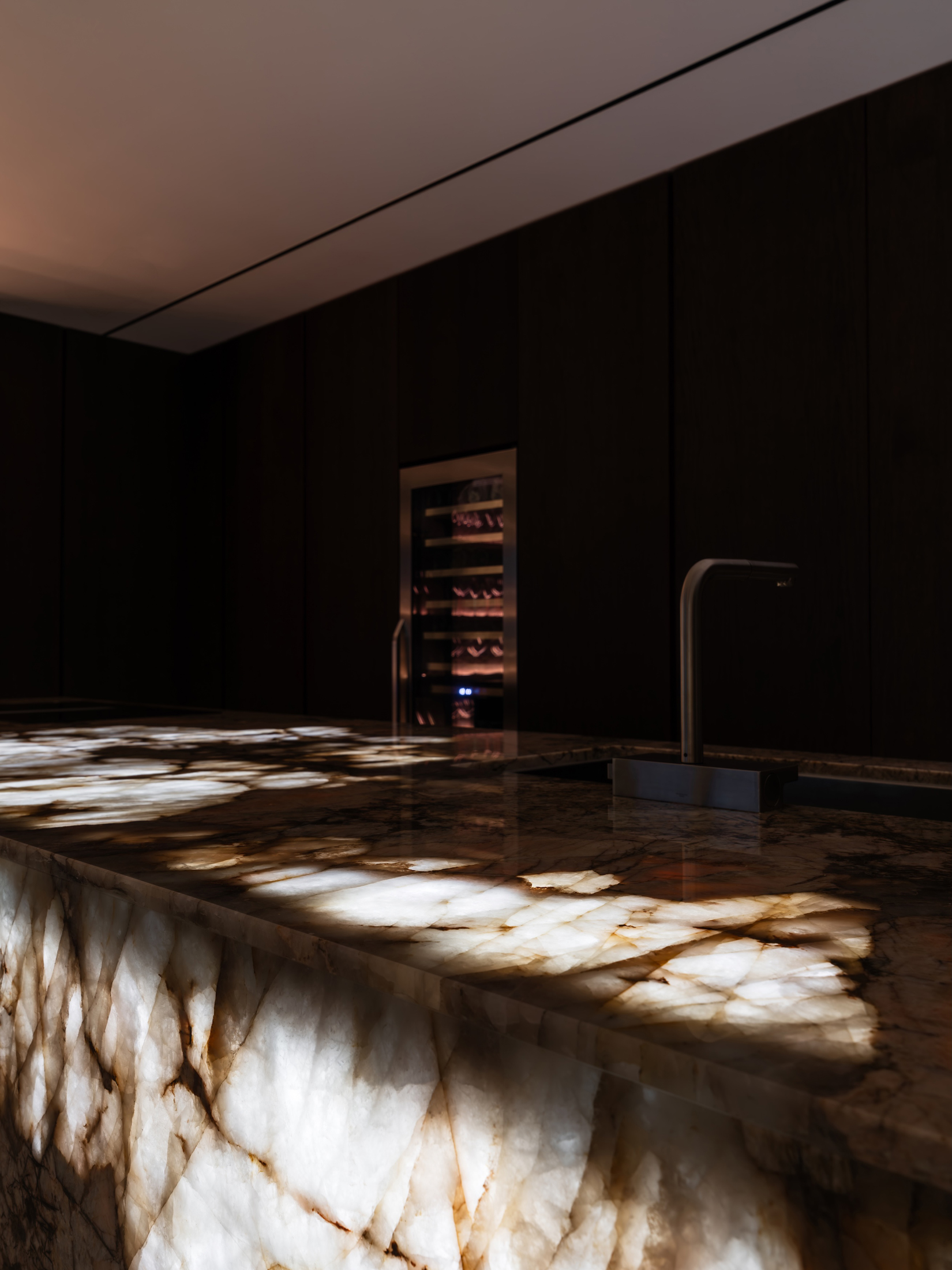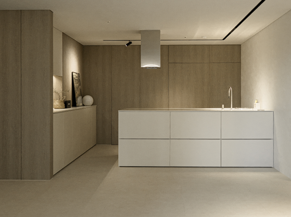 해운대 마린시티의 정점에 위치한 아델리스는 오피스텔 타입 주거 형태로 기존 평면을 개선해 필요한 공간을 극대화하는 레이아웃 작업에 매우 많은 노력을 기울인 공간이다. 불필요한 공간은 과감히 철거해서 필수적인 공간으로 편입시켜 공간을 확대했으며, 고객의 취향과 공간의 특성에 맞는 고급 마감재들로 미감이 충족되도록 설계하였다. 바다와 가장 가까운 곳에 위치한 아델리스의 아침은 윤슬에 반사된 자연광이 집안 내부를 충분히 밝히고 있다. 공간이 자연광을 충분히 머금을 수 있도록 고급도장마감으로 공간 전체를 계획했다. 사실 이번 공간의 특별함은 해가 진 이후부터 드러난다. 클라이언트와 충분히 고민해서 만들어낸 조명 위치와 개수, 그리고 조명하는 방식은 공간을 더욱 완결성 있게 만드는 핵심이었다.