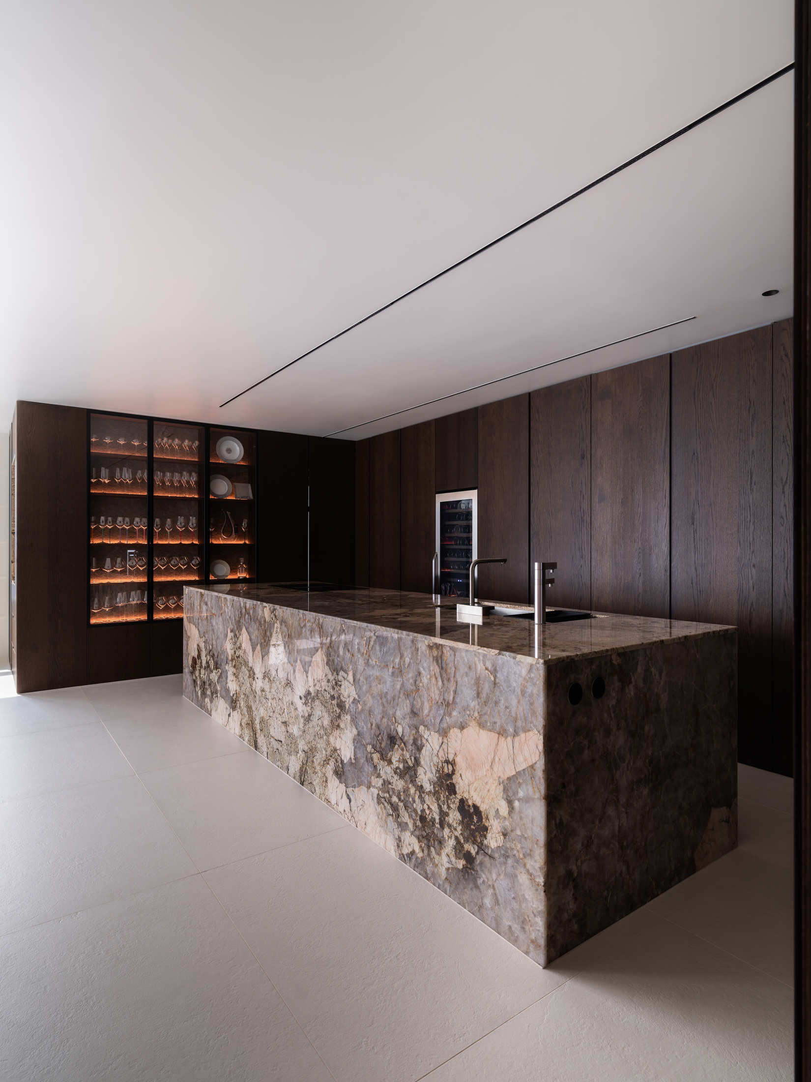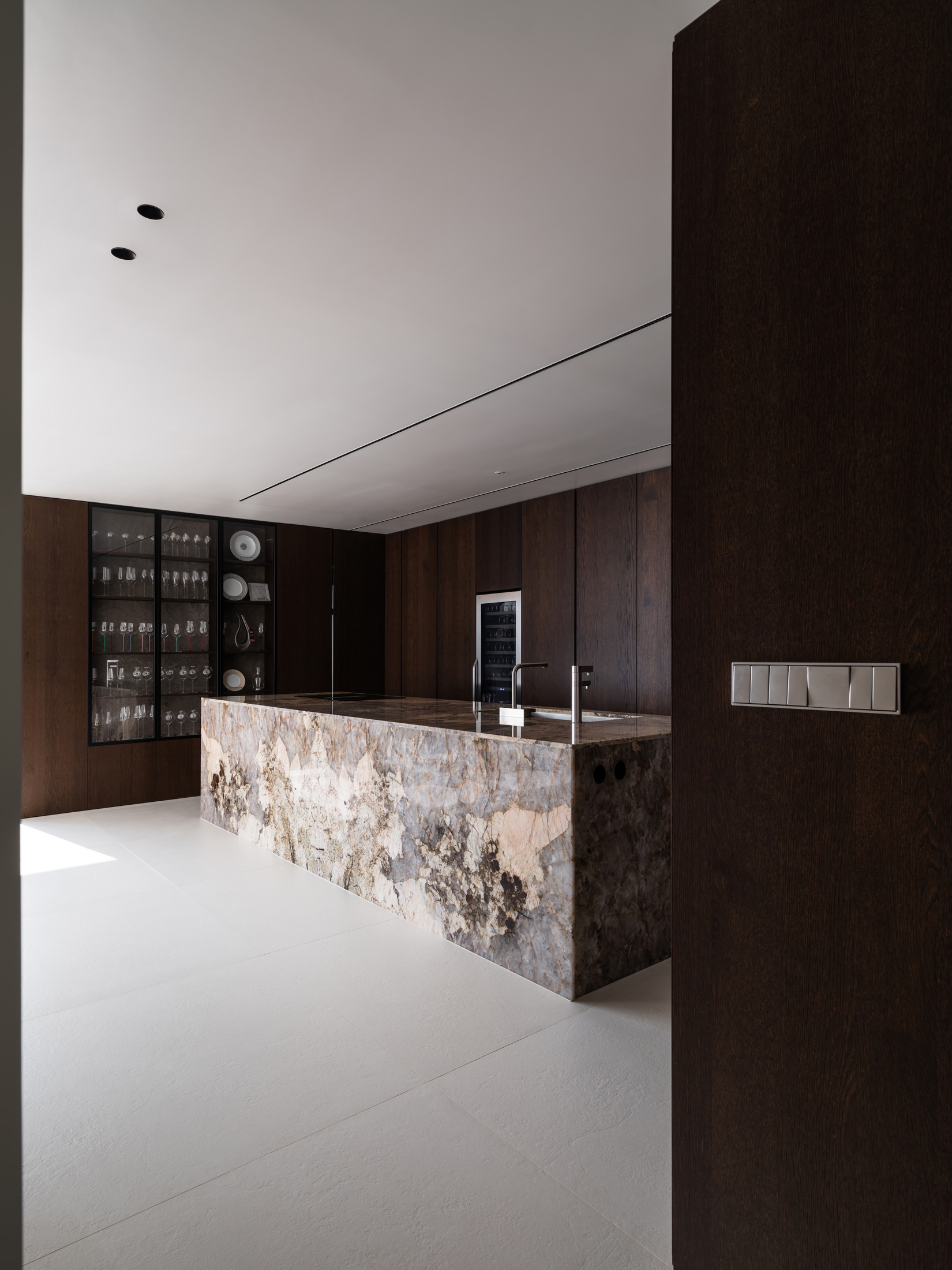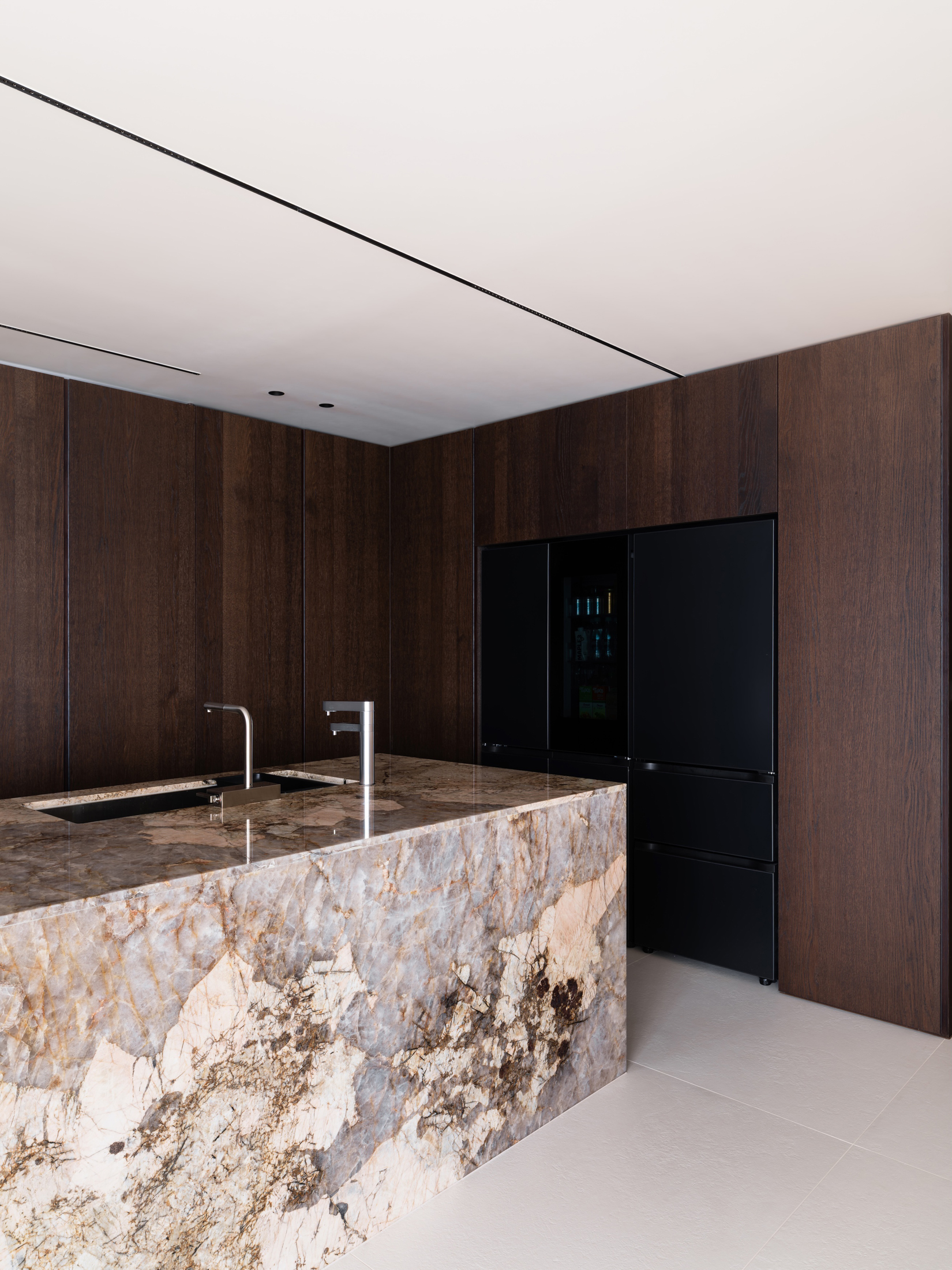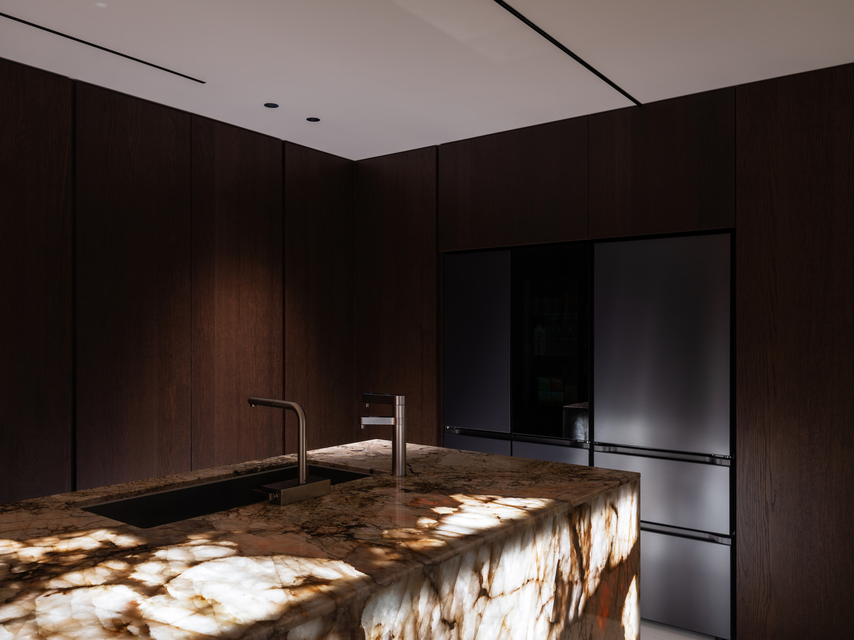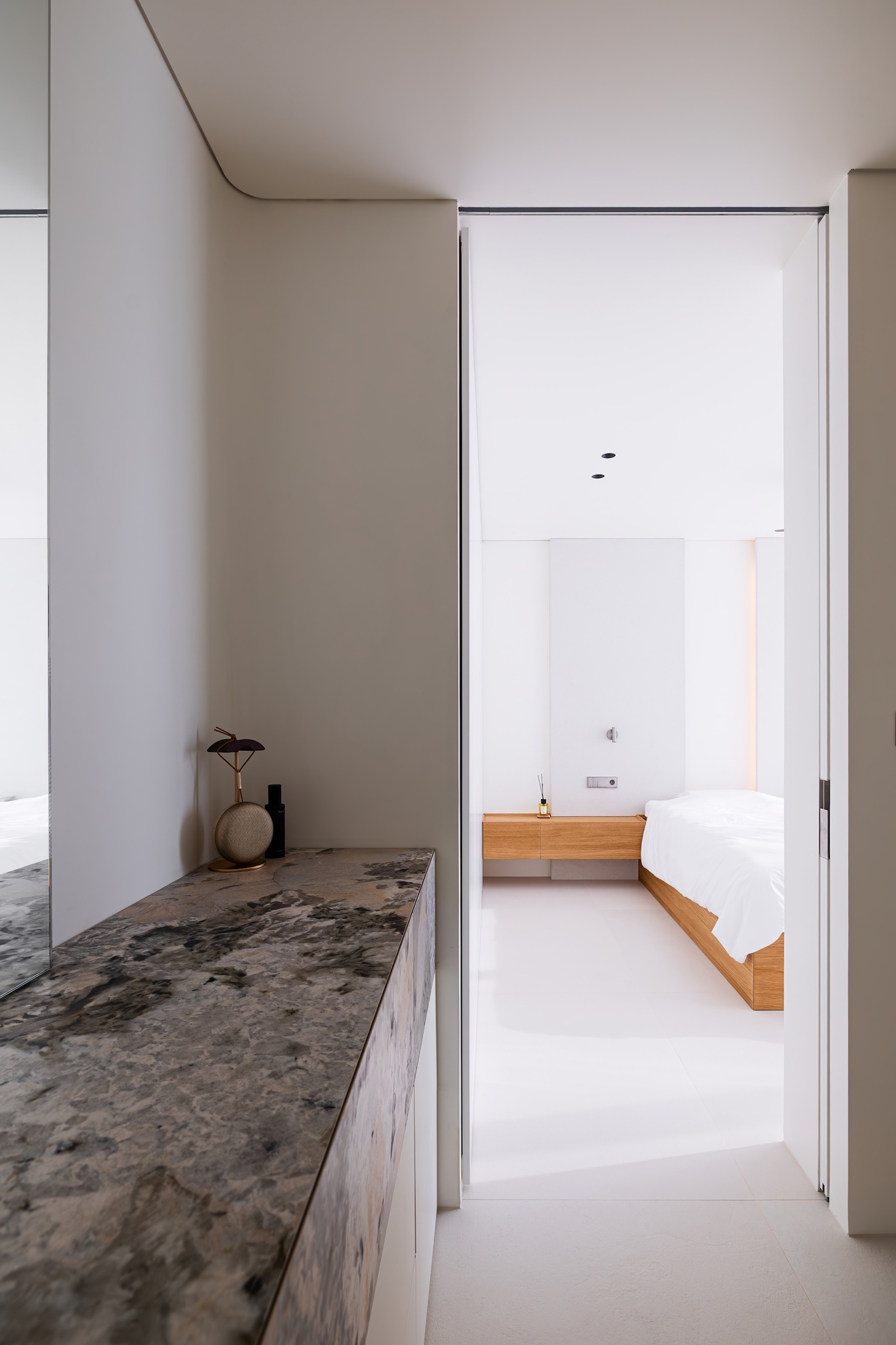 해운대 마린시티의 정점에 위치한 아델리스는 오피스텔 타입 주거 형태로 기존 평면을 개선해 필요한 공간을 극대화하는 레이아웃 작업에 매우 많은 노력을 기울인 공간이다. 불필요한 공간은 과감히 철거해서 필수적인 공간으로 편입시켜 공간을 확대했으며, 고객의 취향과 공간의 특성에 맞는 고급 마감재들로 미감이 충족되도록 설계하였다. 바다와 가장 가까운 곳에 위치한 아델리스의 아침은 윤슬에 반사된 자연광이 집안 내부를 충분히 밝히고 있다. 공간이 자연광을 충분히 머금을 수 있도록 고급도장마감으로 공간 전체를 계획했다. 사실 이번 공간의 특별함은 해가 진 이후부터 드러난다. 클라이언트와 충분히 고민해서 만들어낸 조명 위치와 개수, 그리고 조명하는 방식은 공간을 더욱 완결성 있게 만드는 핵심이었다.